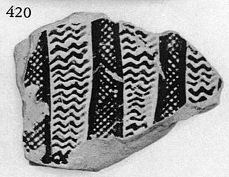 Description:   From the side of a large closed pot, probably an amphora. Three vertical bands of close crosshatching (skirts?) separated by bands of horizontal wavy lines.