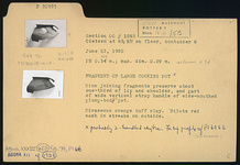 Description:   Nine joining fragments preserve about one-third of lip and shoulder, and part of wide vertical strap handle of wide-mouthed plump-bodied pot.