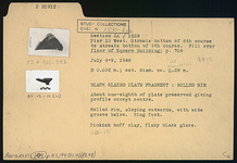 | Description: | About one-eighth of plate preserved giving profile except center. Rolled rim, sloping outwards, with wide groove below; ring foot. Pinkish-buff clay. Flaky black glaze. | |