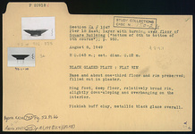 Description:   Base and about one-third of floor and rim preserved; filled out in plaster. Ring foot; deep floor; relatively broad rim, slightly downsloping and overhanging on the interior.