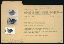 | Description: | Part of neck and shoulder. Alternating diminishing rectangles and checkerboard on shoulder. On neck, vine pattern with a row of dots above and below; small boss at right. Pinkish-buff clay. Black glaze. | |