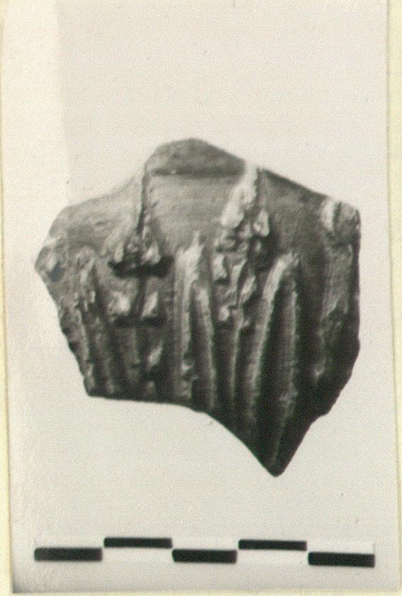 | Description: | Wall fragment. Crude long outline leaves, alternating with stalks terminating in elongated heart-shaped leaves. Pinkish-buff clay. Glaze black on interior, shading to red-brown on exterior. | |