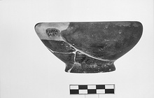 | Description: | About one-quarter preserved with profile complete; filled out in plaster. Ring foot; steep wall; rim curving in sharply at top. Pinkish-buff clay. Dull black glaze, peeled around rim on exterior. | |