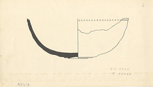 | Description: | Part of medallion and section of wall to bottom of upper zone preserved. Medallion undecorated. On lower wall, indistinct tall, feathered leaves. Above, Nikai advancing to right, carrying wreaths upraised, and Erotes flying to left. Pinkish-buff clay. Glaze fired red to brown, peeled in places. | |