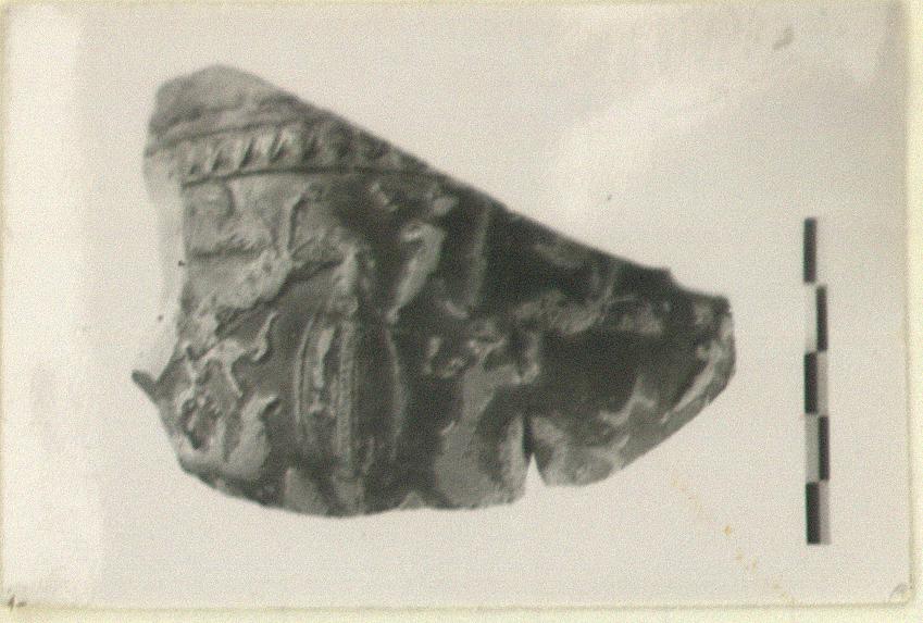| Description: | Above, two upper zones: the upper indistinct, the lower egg pattern. On wall, two Tritons with outline leaf between. Birds, masks, Erotes above. Pinkish-buff clay. Greenish-black glaze. Cf. Agora XXII, no. 173 (P 28603). | |
