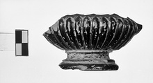 | Description: | Broken away above shoulder. Spreading low base, moulded; deeply reeded lower wall. On floor, four stamped palmettes surrounded by two bands of rouletting. Incised on underside: <graphic> Glossy black glaze. | |
