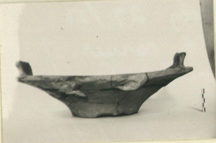 | Description: | Badly broken; about half the rim missing; the stand broken. Shallow bowl; flat rim; two lugs on rim. Cooking ware fabric, blackened in places. | |