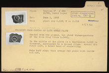 Description:   Mended from two pieces; about three-quarters of the base ring present. In the middle of the plate is a depression surrounded by a raised ridge. Around the outer part, a broad band of rouletting.