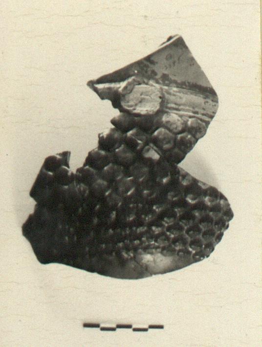 | Description: | Part of lip and much of wall preserved. Outcurved lip with West Slope vine pattern on inside. Wall covered outside with gradually decreasing nodules. Point of attachment of one handle preserved. West Slope medallion on interior. Pinkish-buff clay; black glaze shading to red. | |