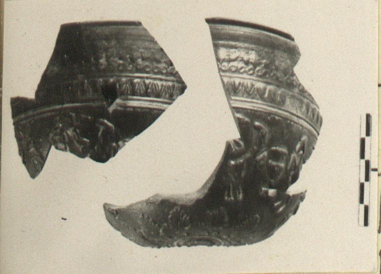 | Description: | Two non-joining fragments each mended from several pieces. Profile complete. Out-turned lip. Rim bordered by two scraped grooves. Palmettes and egg and dart zones on rim. Goats flanking kantharos, Erotes with masks on wall. Palmettes in two rows around medallion; rosette in medallion. Reddish-brown clay; good metallic glaze. Cf. Agora XXII, nos. 108, 298. | |