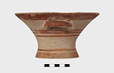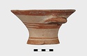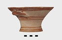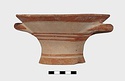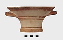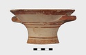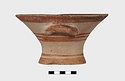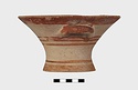 Description:   Intact, except for chips. Flat-bottomed pot wth flaring concave sides resembling a kalathos. Plain rim, flat on top. Two short horizontal handles attached below rim.
