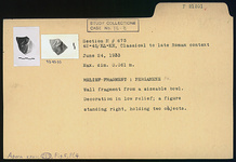 | Description: | Wall fragment from a sizable Pergamene bowl. Decoration in low relief; a figure standing right, holding two objects. | |