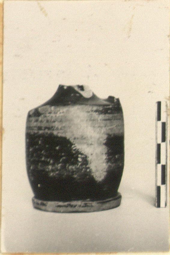 | Description: | Neck and handle missing. Squat lekythos; ring foot; walls almost vertical; sharp angle at shoulder. Black glaze, except on underside and edge of foot; much worn. Reserved band just below shoulder; two brown stripes in it. Cf. P 21226. | |