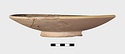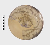 | Description: | About one-quarter of the side is gone; the rest of the plate mended from many pieces. A man in armour is represented fighting a human-headed serpent, the coils of whose body edge the rim in a series of loops. The greater part of the man's body and his right leg have disappeared, also the end of his right arm and the tail of the snake. The drawing is very spirited, although not careful. Pinkish-buff clay with bits; unglazed on the outside, yellow glaze with brown sgraffito on the interior. | |