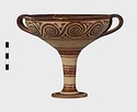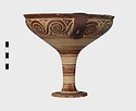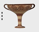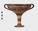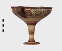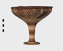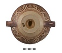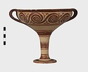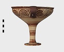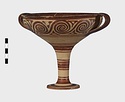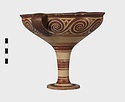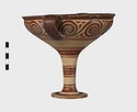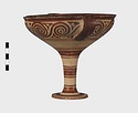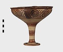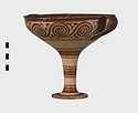 | Description: | Mended from seven pieces; complete except for one handle. Narrow lip out-turned and offset; bowl rounded, relatively deep; band handles scarcely rising above rim; tall slender stem; broad foot with circular depression at center beneath. Lip glazed inside and out; handle glazed outside. Decoration in main zone: double interlocking running spiral with triangular filling ornament above two sets of three narrow bands. Banded stem; one broad and one narrow band, then a broad band between two narrow; and another narrow and broad. The upper part of the foot banded; the edge and outer face glazed. Pale buff clay, smooth lighter buff slip; red-brown glaze, slightly streaked. Amarna parallels for spiral; early 14th c. B.C. Cf. Archaeology 4 (1951) pp. 224-225 for pattern. | |