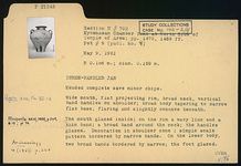 Description:   Mended; complete save minor chips. Wide mouth, flat projecting rim, broad neck, vertical band handles on shoulder; broad body tapering to narrow flat base, flaring and slightly concave beneath. The mouth glazed inside; on the rim a wavy line and a thin band; a broad band around the neck; the handles glazed. Decoration in shoulder zone: simple scale pattern bordered by narrow bands. On the lower body, two broad bands bordered by narrow; the foot glazed.