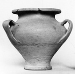 | Description: | Intact save for missing chip from foot, and piece of rim; mended. Broad body with sharp taper to rather broad offset foot, concave beneath. Wide mouth, flat straight-edged rim, short neck forming continuous curve with rim and shoulder; vertical ribbon handles set well down. Buff clay, lighter buff slip; undecorated. | |