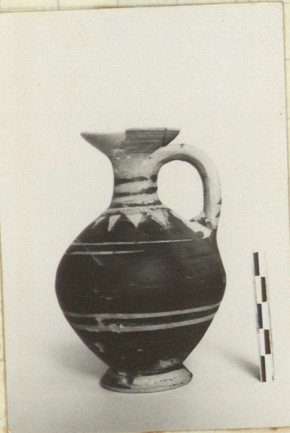 | Description: | Front of lip missing, otherwise intact. Plump ovoid body; flaring ring foot and flaring rim; band handle from below rim. Decoration: lip glazed inside; horizontal stripes on handle. Three bands around the neck; from a fourth hang reserved triangles, the points down. Two reserved lines around shoulder at point of lower handle attachment, and another pair around lower wall. Foot reserved underneath. Pale buff clay; black to reddish-brown glaze, worn on mouth and handle. | |