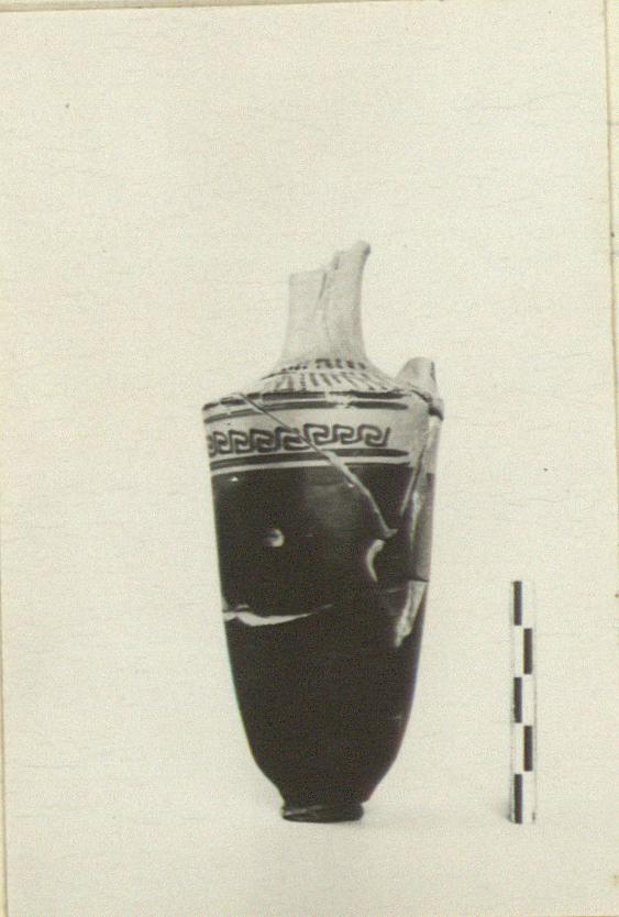 Description:   Foot, mouth, and handle missing; mended from several pieces. Narrow body, slightly concave profile below shoulder. On shoulder, bars and rays. Just below shoulder, running maeander right; the rest all black. Nothing at junction of foot. Red wash on reserved areas. Another variety of black bodied lekythoi. For shape cf. P 21271.