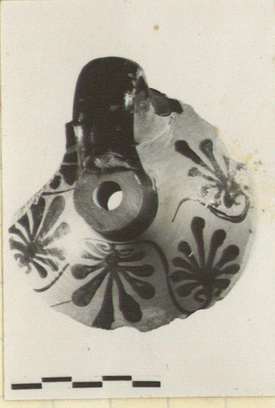 | Description: | Shoulder and neck, with handle. Slight groove at join of neck-shoulder. Decoration on shoulder: five palmettes, three in the middle, one downward in the middle, from which tendrils ending in upright palmettes on either side. On either side of this central palmette motive, one loose palmette. Red wash. Cf. P 24541 (palmette neck). | |