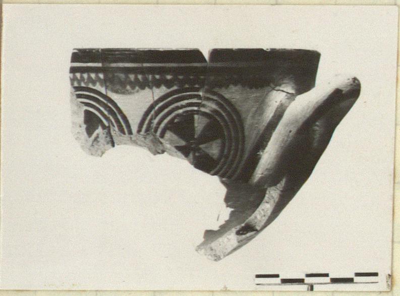 | Description: | Part of rim, one handle, and most of wall profile preserved; mended from nine fragments; three small pieces do not join. Thin walls; slightly flaring lip, relatively deep rounded bowl; horizontal loop handle, flaring. Glazed inside, reserved band at top inside lip. Outside lip, medium band; below, thin band and zigzag. Handle zone: compass-drawn series of four concentric circles, maltese cross inside. Below, four narrow bands, then solid glaze. A band on the handle, and a tail to either side. Yellow-buff clay, black glaze. Discoloration from burning. Cf. P 6673, P 6846. | |