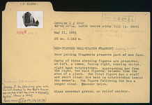 | Description: | Four joining fragments preserve part of one face. Parts of three standing figures are preserved; at left, a woman, facing right, wearing chiton, right hand outstretched. Approaching her from the right, two male figures; between them the stem of a plant. The first figure has a staff and short cloak; his hand is outstretched toward the woman's. The figure following him has a longer cloak. Maeander below. Glaze somewhat grayed; no relief contour. | |
