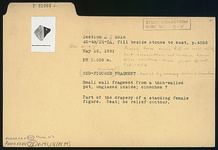 | Description: | Small wall fragment from a thin-walled pot, unglazed inside; oinochoe? Part of the drapery of a standing female figure. Neat; no relief contour. | |