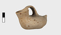 | Description: | Intact; surface damaged. Elongated, tailed, flat below. Wide spout; flat handle from lip to about the middle of the body. Cream slip. Most of painted decoration gone. Rim and handle once painted. Running dog pattern runs on the upper part, from the tail, around the base of the spout and back again. Band around the elliptical bottom. | |