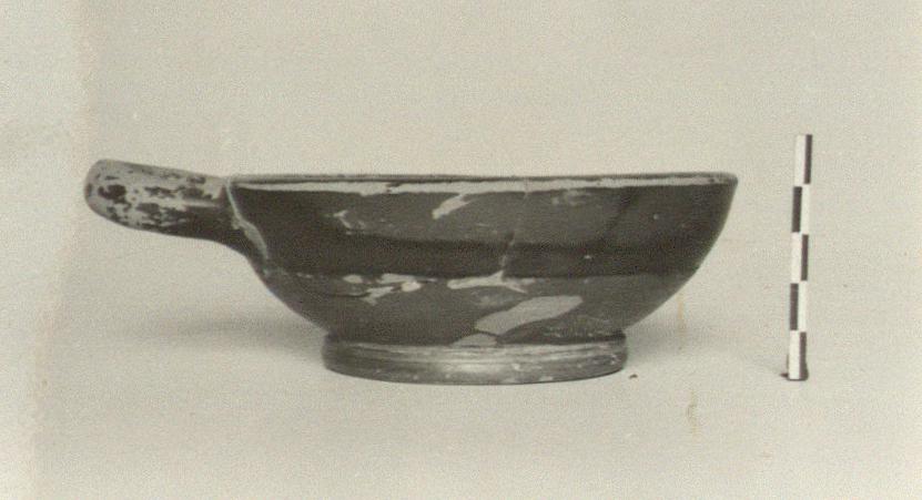 | Description: | Mended from several pieces; a few small scraps of wall missing. Ring foot rounded on outside and lightly profiled at upper edge; flaring on inside beneath. Rim slightly rounded on top; stubby handle slightly up-tilted. Glazed over all except resting surface and a reserved line on underside next to foot. The glaze fired red and black: red inside and on lower part of outside as if from stacking; on upper part of outside, including rim and handle, mottled red to black. Both red and black considerably peeled, and the handle worn. Cf. Agora XII, no. 749. | |