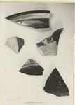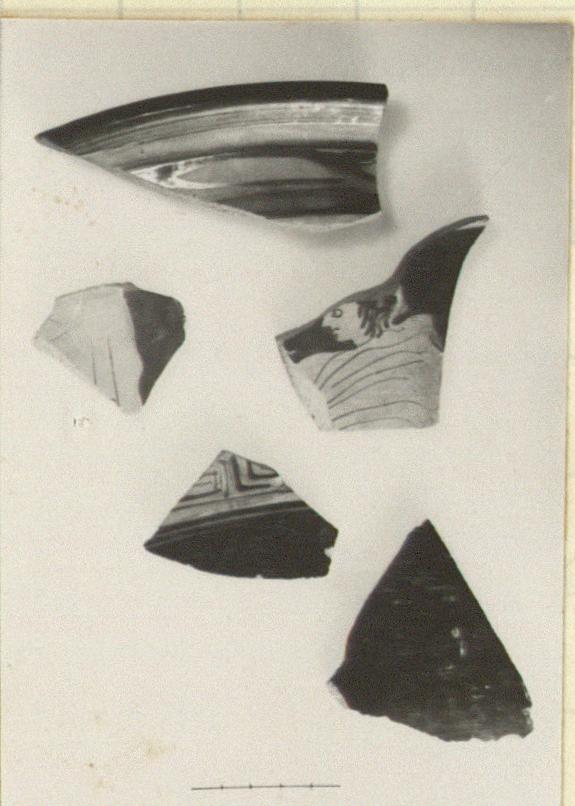 Description:   Five fragments: wreath at the rim; sets of maeander below the picture of which parts, including the head of a youth to left, are preserved; he wears himation. No relief contour.