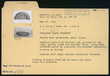 | Description: | Nearly half preserved; small chips. Shallow Type A plate with moulded rim, grooved on the edge; groove around the moulded floor. Ring foot bordered above by a groove; two moulded concentric circles on bottom. Pinkish-buff clay; surface carefully finished. Cf. Agora XII, no. 1012. ADDENDA Joining fragment from box 10 makes the plate about three-fourths complete. Restored in plaster. | |