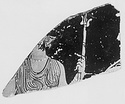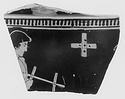 | Description: | Two fragments, one mended from two pieces, give parts of the pictures on both sides and the beginning of the rim. Non-joining lug handle. Reserved groove at the junction of mouth; band with strokes above the picture. On each side two youths conversing. A) Lower half of one figure to right, wrapped in himation, feet missing; head and part of chest of youth, wrapped in himation to left. Between them a strigil hangs. B) Head and chest of a youth to right. He wears himation and holds lyre in right hand. Of his companion only part of the forehead hair is seen. Between them a cross-like object hangs. N.B. difference in style of the two sides B) painted by another hand in a more developed style(?). Relief contour only for the lyre and the cross-like object. | |