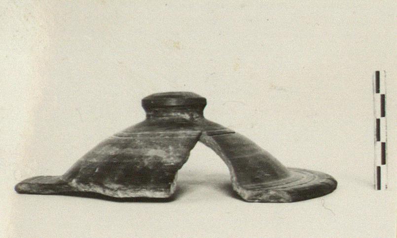 | Description: | Three joining pieces give the full profile and diameter. Domed lid with flat topped knob; flat projecting rim, no flange. Two grooves at upper part of the main lid and around the top of the rim. Dark red glaze inside and out, fired black at the edge. Very micaceous red clay. | |
