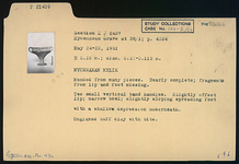 | Description: | Mended from many pieces. Nearly complete; fragments from lip and foot missing. Two small vertical band handles. Slightly offset lip; narrow bowl; slightly sloping spreading foot with a shallow depression underneath. Unglazed; buff clay with bits. | |