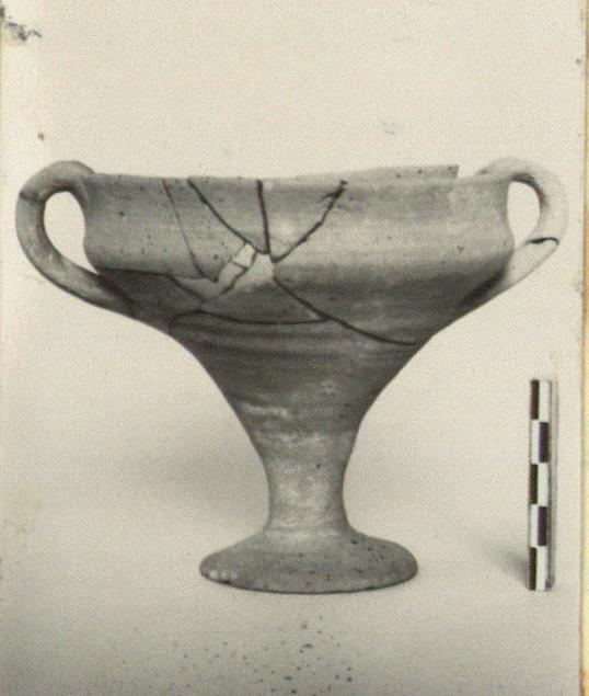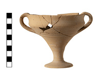 | Description: | Mended from many pieces. Nearly complete; fragments from lip and foot missing. Two small vertical band handles. Slightly offset lip; narrow bowl; slightly sloping spreading foot with a shallow depression underneath. Unglazed; buff clay with bits. | |