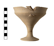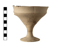 | Description: | Mended from four pieces. Complete but for lip fragment and handle; cracked at lip. Offset lip, narrow bowl, medium stem; sloping foot, depression in the center underneath. Very pale coarse buff clay; unglazed. Cf. P 21411, P 21413. Addenda 2025: Angular kylix (FS 267). Semi-fine very pale brown (7YR 7/4) fabric with small to large dark gray, pale orange, and calcareous stone inclusions. Import (Argive?) (TVD). | |