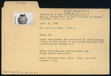 | Description: | Upper neck, handle and one-third of body missing. A hole at the center of the bottom may have been intentionally chipped out. Small thick-walled flat-bottomed jug. Rough banded decoration. Pink clay, not well cleaned. Glaze reddish-black, worn. | |