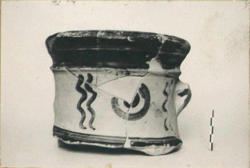 | Description: | Neck preserved without handles. Thickened rim; lower part of mouth concave, ridge at beginning of neck. Vertical wavy lines flank a thick dotted circle. Rim black; black band at lower part of neck. Attic clay with red bits. ADDENDA Agora sample no. 262. | |