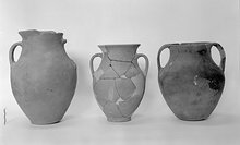 | Description: | About half of mouth and fragments of wall missing; restored in plaster. Ring foot; flaring rim; band handles set low on neck. Finger impression at lower attachment of handle. Very gritty coarse dark red clay. Unglazed. Handmade. Not less than four fragmentary such pots left in tins. Some sherds in every box. | |