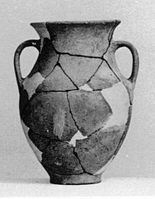 | Description: | About half of mouth and fragments of wall missing; restored in plaster. Ring foot; flaring rim; band handles set low on neck. Finger impression at lower attachment of handle. Very gritty coarse dark red clay. Unglazed. Handmade. Not less than four fragmentary such pots left in tins. Some sherds in every box. | |
