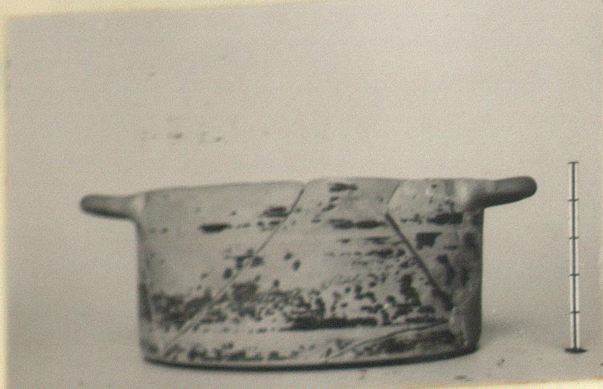 | Description: | About two-thirds preserved; fragments from wall, including both handles and part of bottom, missing. Small pyxis; flat bottom; straight walls. Outside: glazed except reserved line below handles and another at the lower part. Pale buff clay. Late Protocorinthian(?). Other fragmentary pyxides left in tins. | |