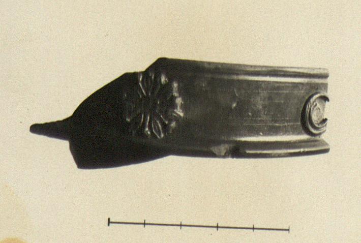| Description: | Rim and wall fragment of Western Sigillata bowl with keeled rim. In relief on outside of rim, rosette and spiral. Groove below lip. Cinnamon clay; firm red glaze. | |