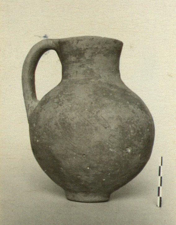 | Description: | Intact except for small chips from rim. Plain rim, high slightly flaring neck, round body, narrow base, flat bottom, flattish handle from rim to body. Covered over all with reddish glaze paint, mostly worn. Pinkish-buff clay full of impurities. | |
