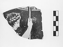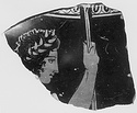 | Description: | From upper wall of an amphora. Head of a youth, wreathed, to right, holding two spears. Above egg. Relief contour; hair rendered in thick glaze; two berries of wreath at forehead in faded white. ADDENDA (Sept. 2020), according to Agora XXX, Pelike fragment. | |