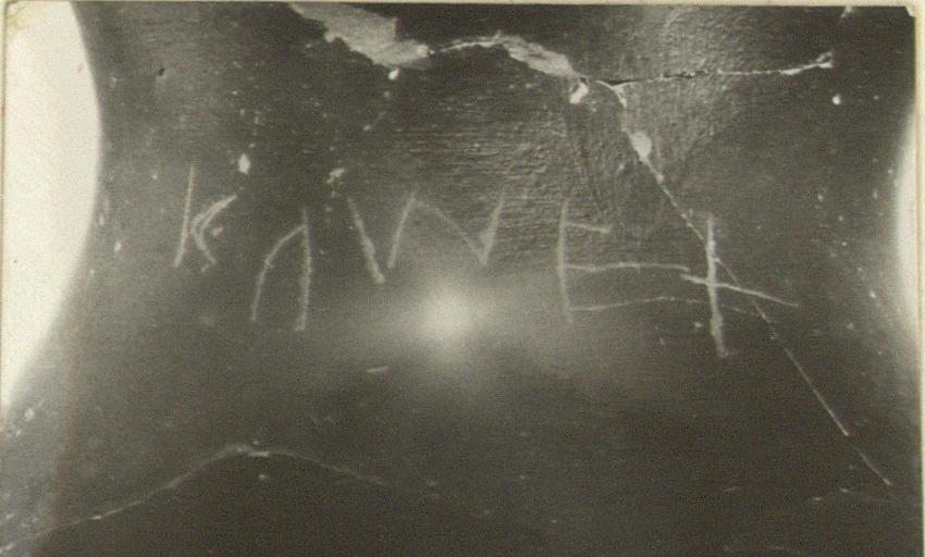| Description: | Much of lip and walls, and part of base missing; restored in plaster. Ring foot with broad resting surface; short neck; handle from rim; rather tall straight body. Graffito, complete, on one side of the neck: <graphic> Black glaze, rather dull, over all outside, except on lowest part of wall and under foot. Thin wash inside. | |