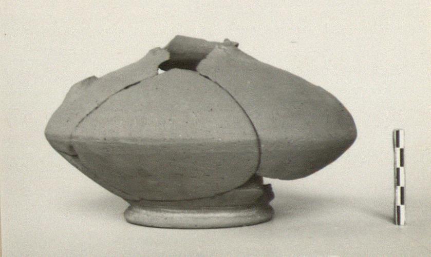 | Description: | Mended from several pieces; preserved to start of ring, but much of walls missing, and both handles except for lower attachments. Ring foot; angular body; very short neck. Lower attachments of handles set fairly far apart. Pinkish-buff clay. Unglazed. Cf. Agora XII, no. 171 | |