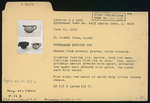 Description:   Mended from several pieces; chips missing. Slightly flaring lip, narrow, very low base, flattish handle from rim to body. Rim, spout, probably handle covered with paint; probably the upper half covered with paint, the lower part with bands.