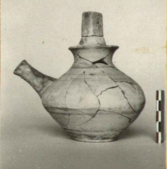 | Description: | Mended from many pieces; small fragment and chips missing at joints. Band basket-like handle, flaring mouth, bulging body, narrow, not articulated base, bottom a little concave. Spout painted over all; elsewhere band decoration. Inside unglazed. Grayish clay; dull dark brown poaint. | |