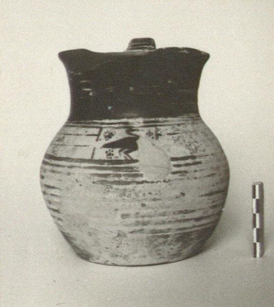 | Description: | Fragment of mouth missing; surface chipped and damaged in places, filled out in plaster. A squat oinochoe with wide mouth and lip slightly modelled toward trefoil shape. Flat bottom. Neck and lower body glazed; elsewhere horizontal bands. Upper part of body at front, small panel with bird in silhouette to right; filling ornament; dot rosettes and swastika. On handle, cross strokes above and below; a large X in the middle. Buff clay; glaze red to black. | |