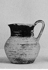 | Description: | Fragment of mouth missing; surface chipped and damaged in places, filled out in plaster. A squat oinochoe with wide mouth and lip slightly modelled toward trefoil shape. Flat bottom. Neck and lower body glazed; elsewhere horizontal bands. Upper part of body at front, small panel with bird in silhouette to right; filling ornament; dot rosettes and swastika. On handle, cross strokes above and below; a large X in the middle. Buff clay; glaze red to black. | |